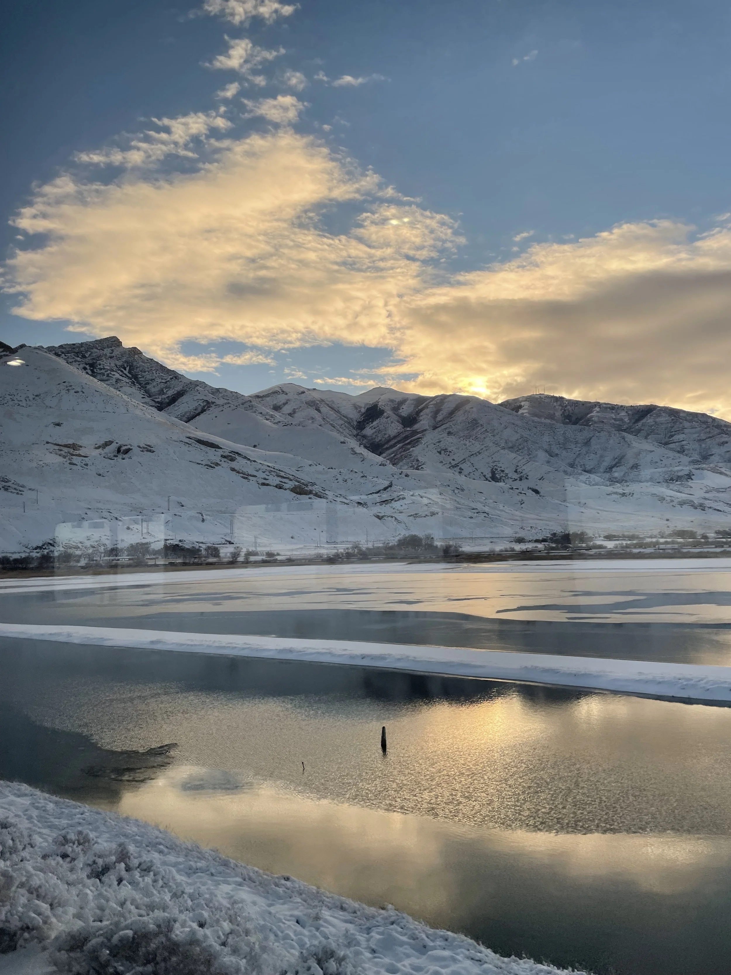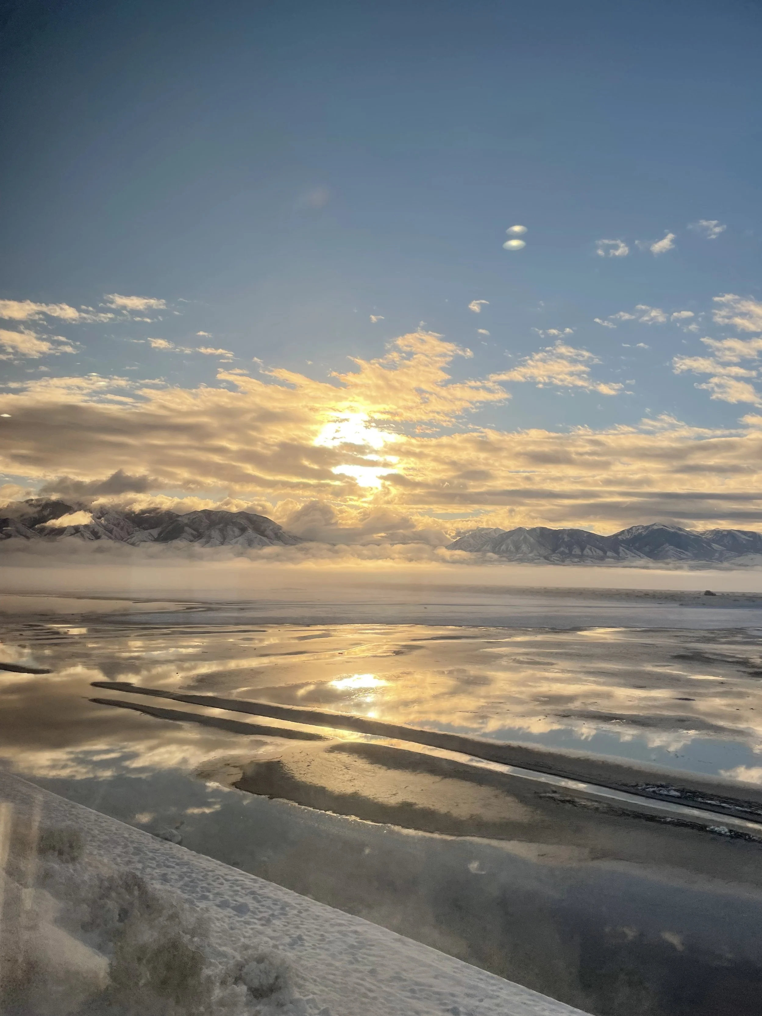 I woke up, moving, as the sun rose over the salt flats of Utah. This was super beautiful, but not something I was supposed to be seeing, as we should have passed SLC at 3am. The freighter situation had delayed us 6 hours!