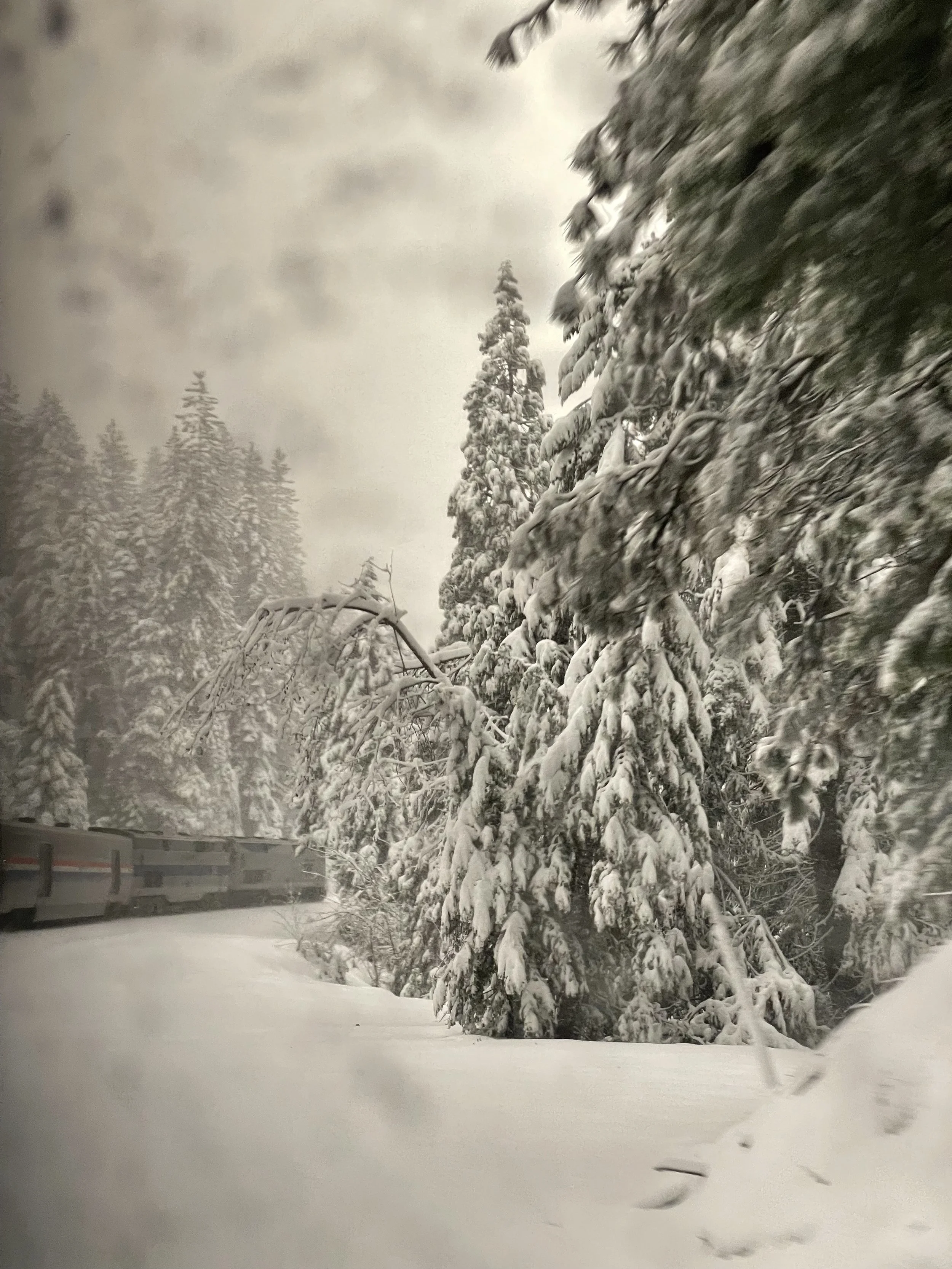 We departed the Bay in the pouring rain. The train chugged westward, climbing the Sierra Nevadas to Truckee, where the rain turned to snow.