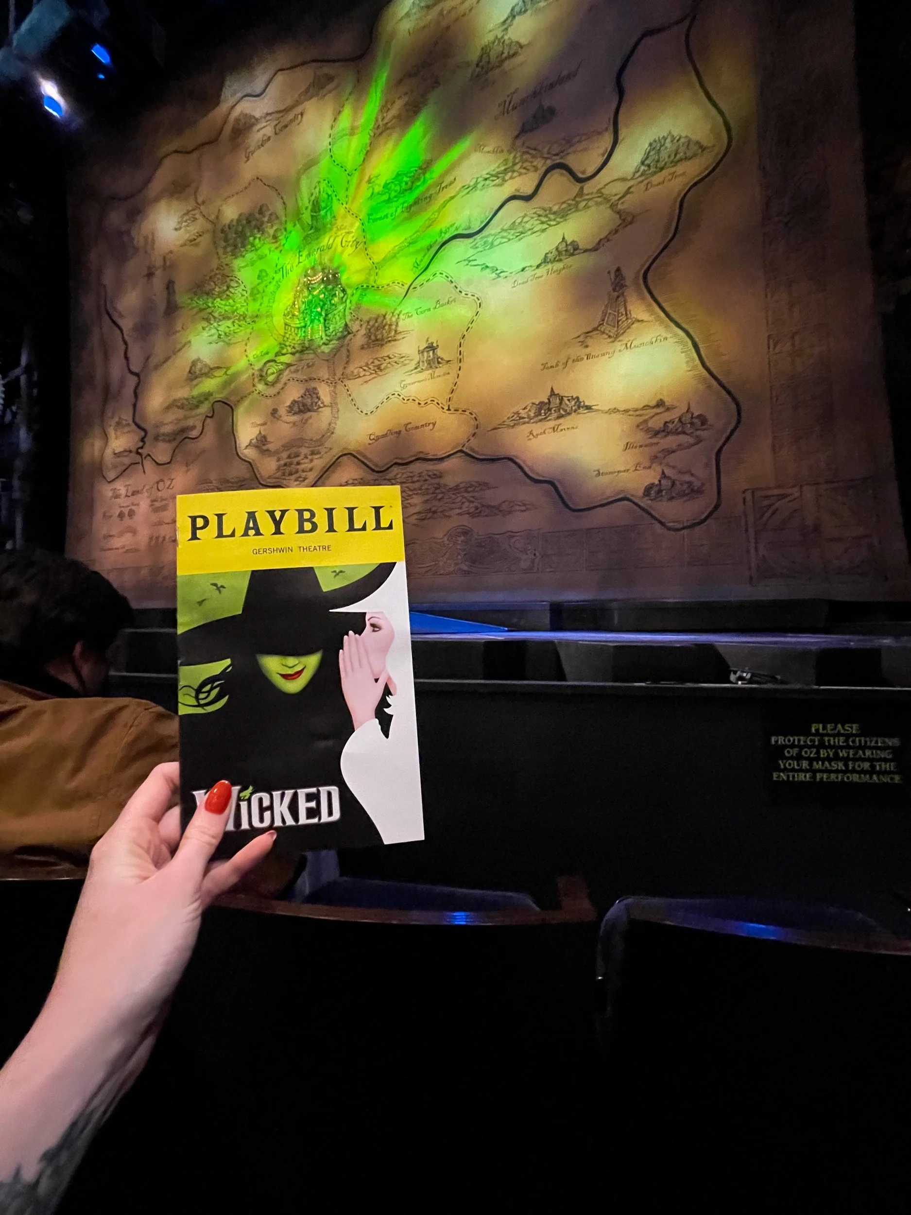 One of the myriad pluses of solo travel is you can get a last-minute ticket for cheap, which is how I found myself sitting in the second row at Wicked. (I had this same thing happen at Hamilton in 2017. Highly recommend getting over feeling awkward and just going to things alone once in a while, you’ll survive).