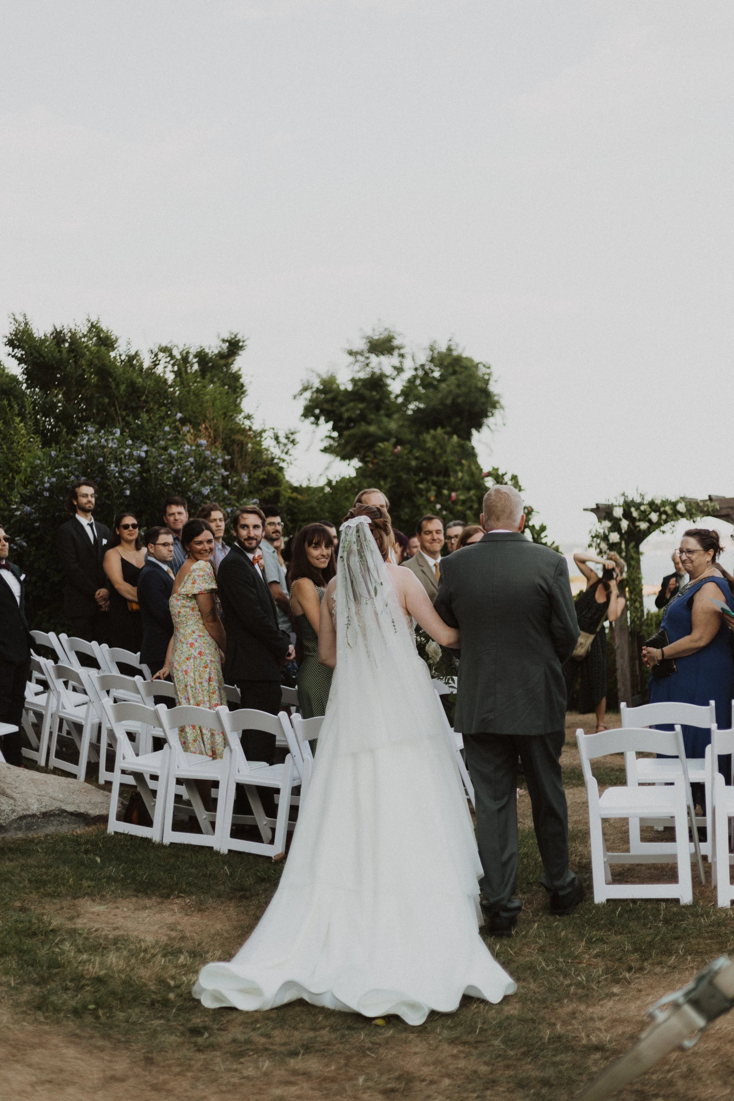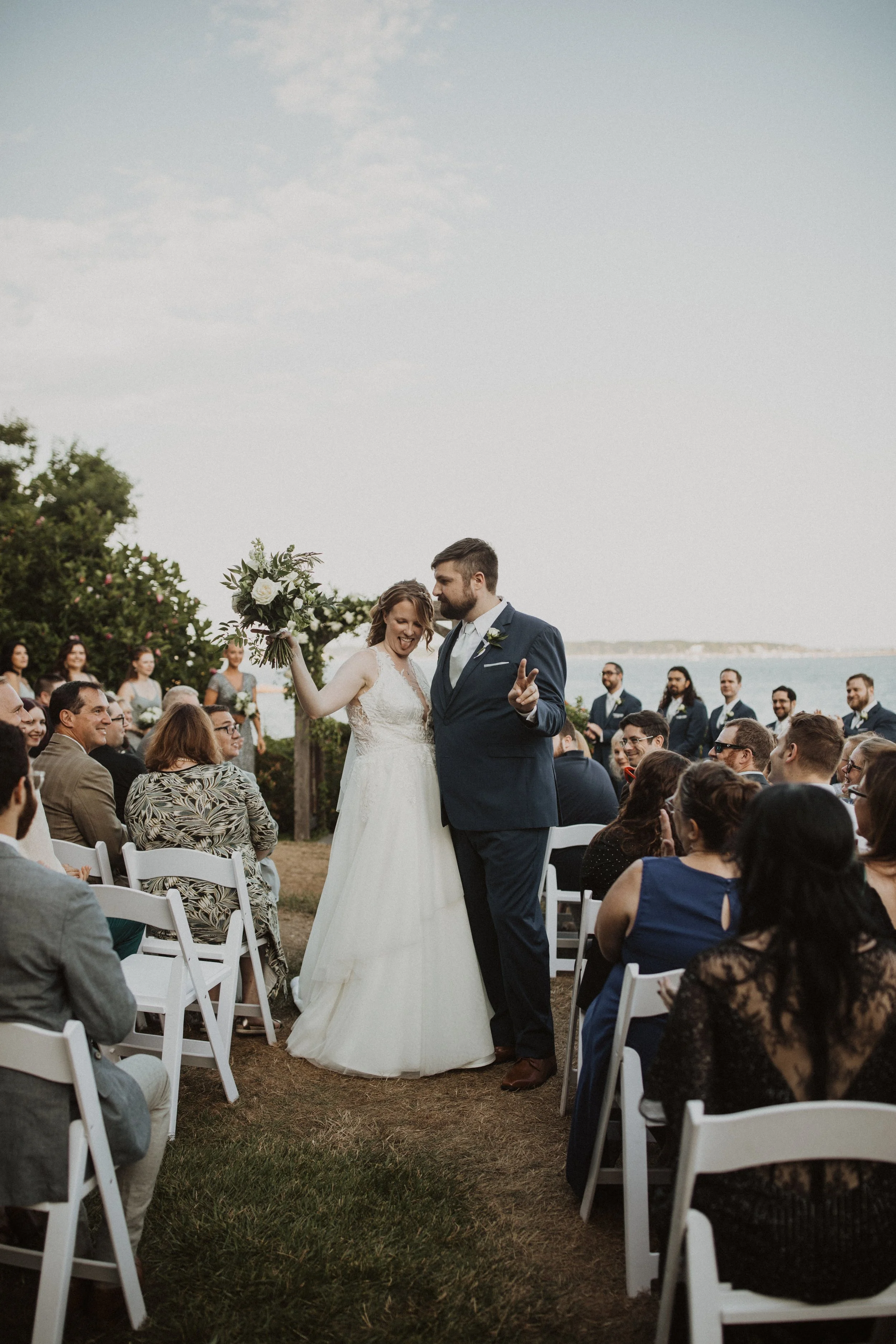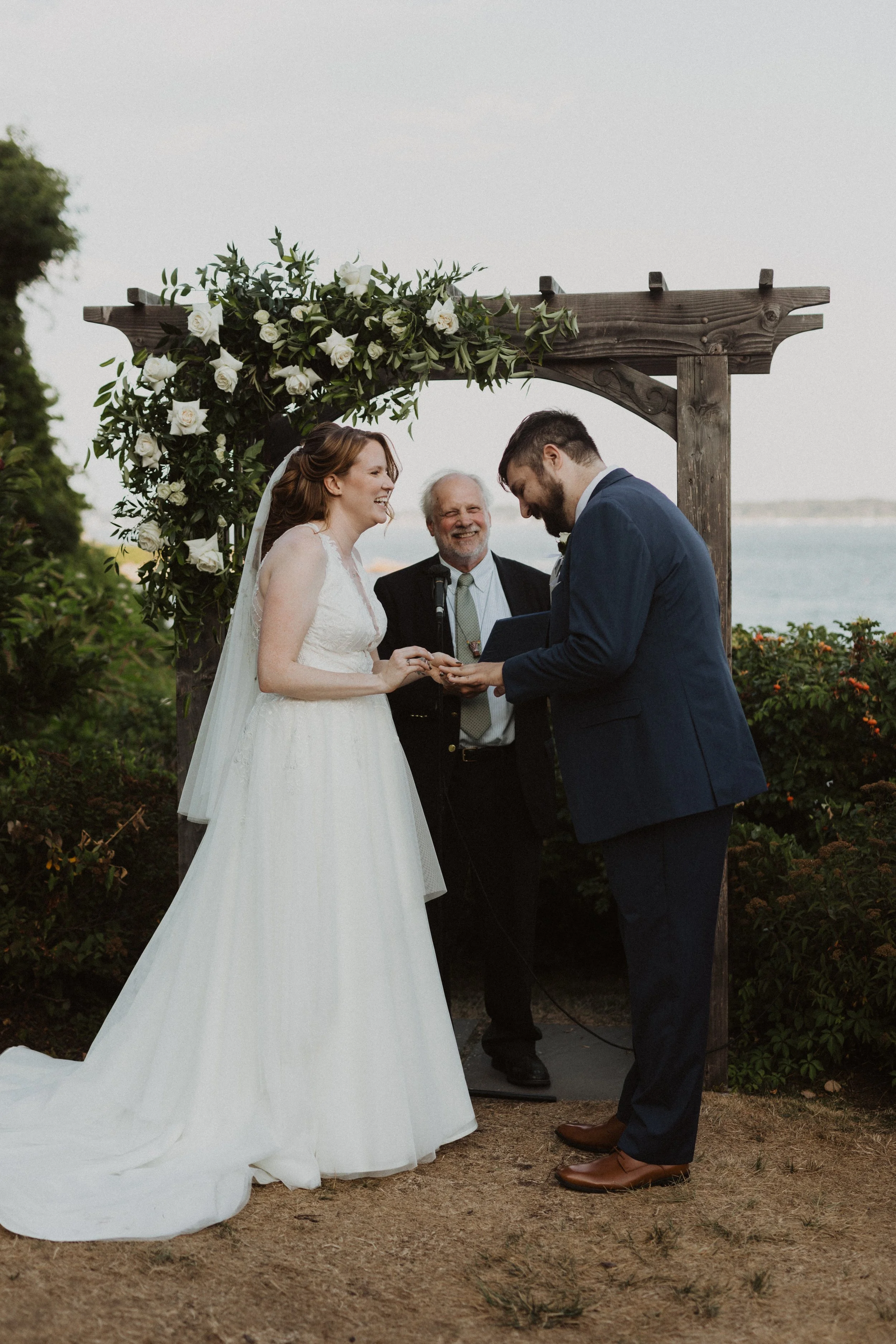Our officiant was Larry Brickner Wood. He was the campus chaplain at UNH during my time there and director of the Waysmeet Center, a community space that I have many happy memories in. Larry is a preacher, but we kept our ceremony short, sweet, and agnostic. My favorite moment was beginning with a centering meditation with everyone; it had finally cooled off, the waves were crashing against the shore, and we could just FEEL all the love and support that surrounded us.