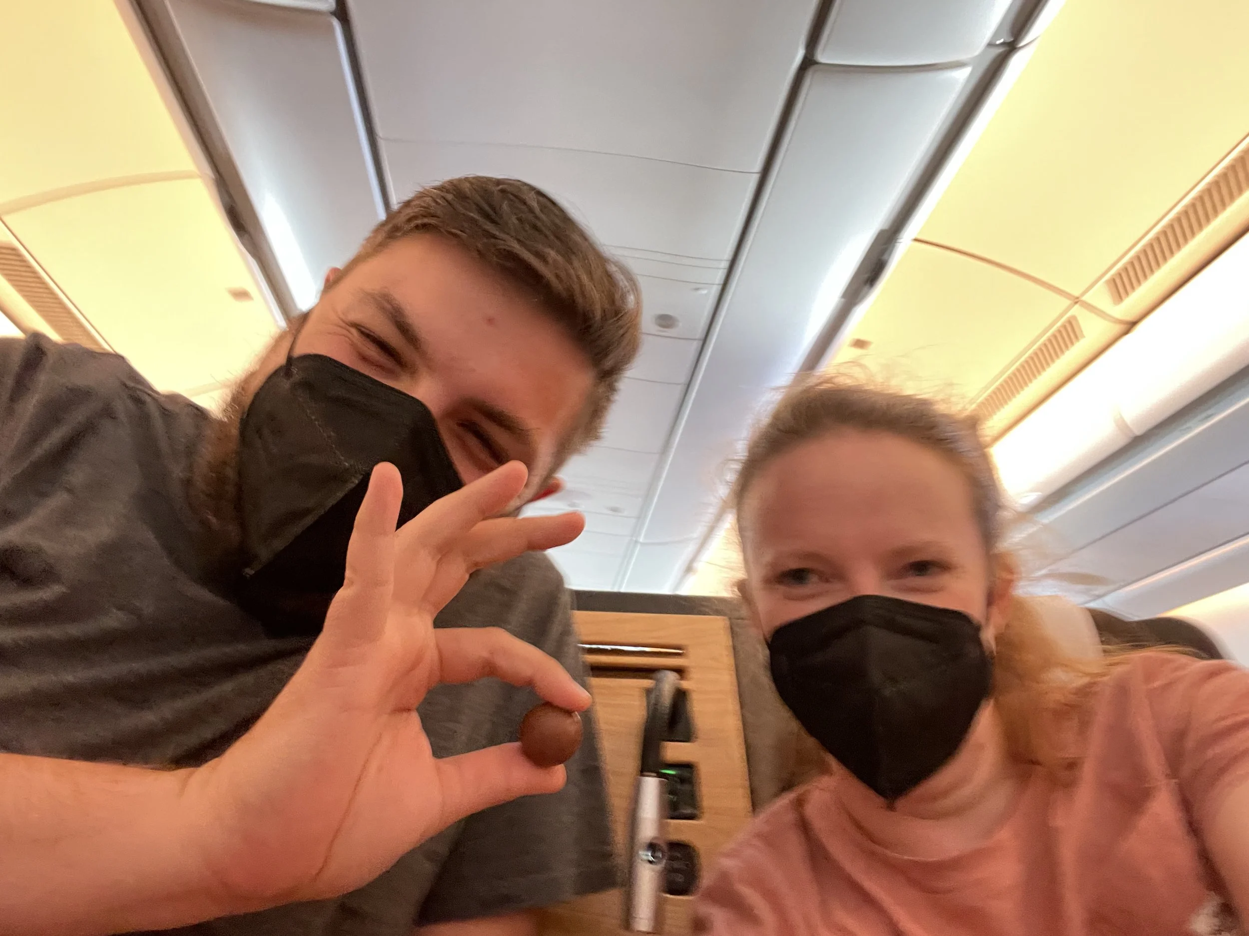 I spy another flight attendant and use the honeymoon card again. This time it works, and he takes me and Chris to our new seats. Surprise, this seat is also broken!