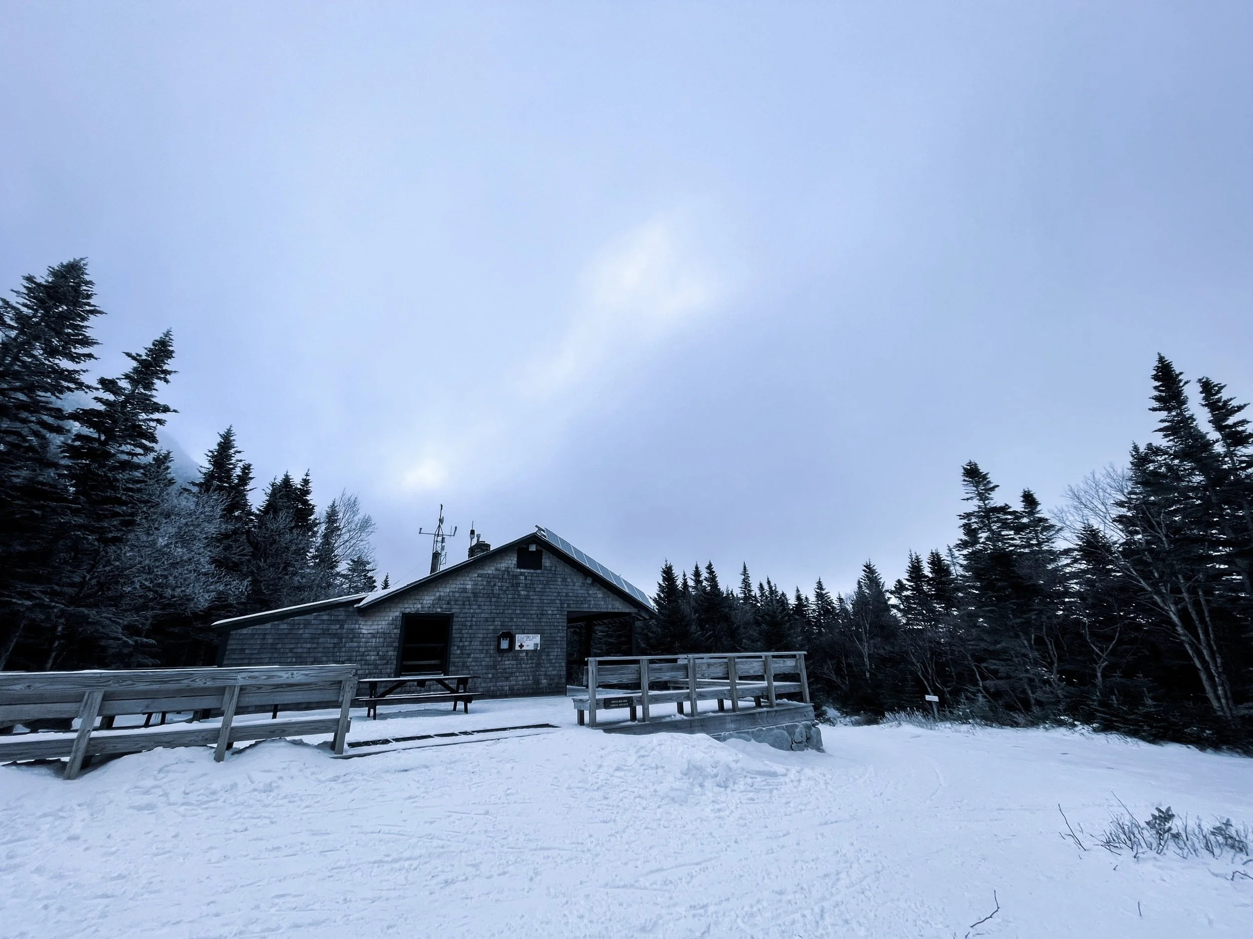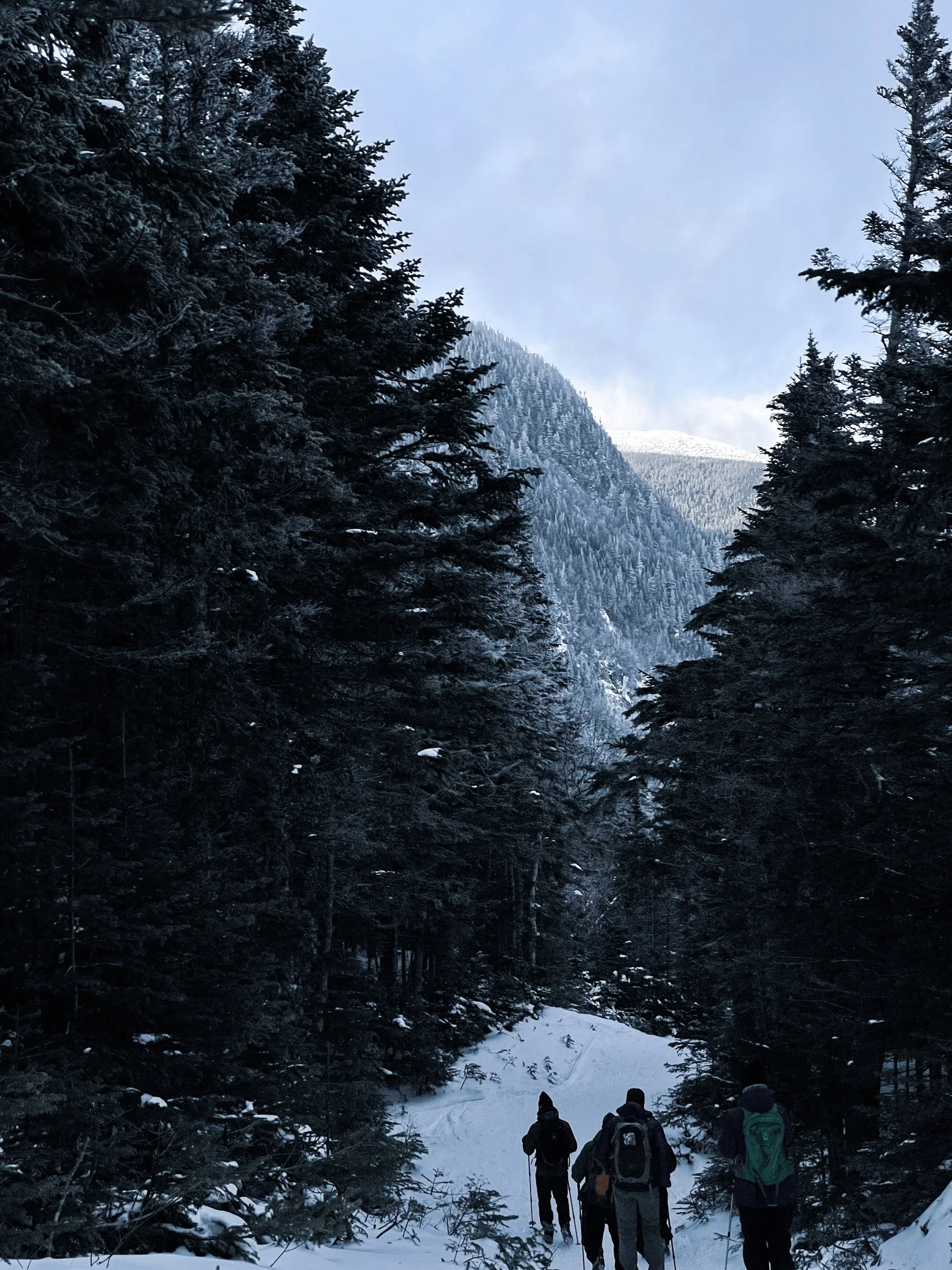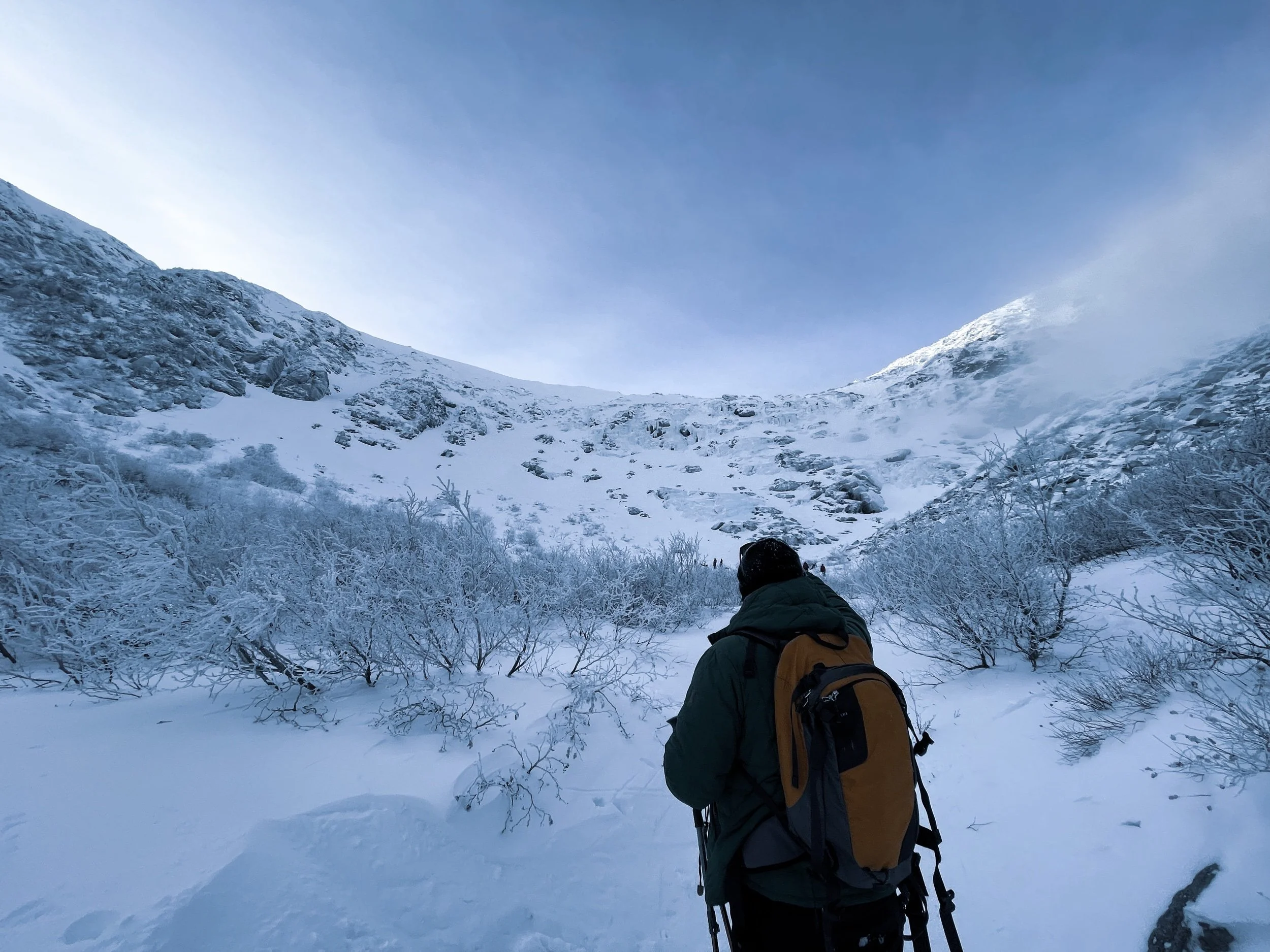 It was cold as shit at Pinkhams Notch. The AMC lodge there had some rental gear that came in clutch for our crew (including me… I need to buy some poles). We strapped on our microspikes and headed up.
